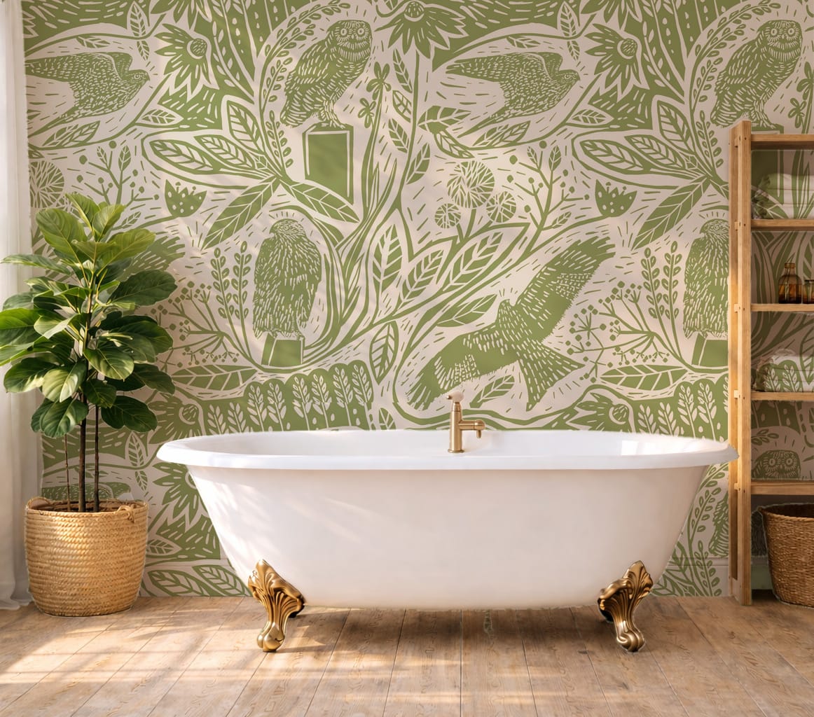 For more inspiration from the artist: check out the the Deep Greens Wallpaper Mood Board! Jessa Bray shows us her vision for this wallpaper, with coordinating furniture, decor, and color ideas for this print.